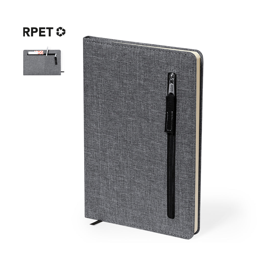 Notepad made of RPET 300D. With hard covers and pocket in back cover with zip closure. Includes 100 sheets with single-striped layout,, elastic band closure and side pen holder. In grey, with elegant black details. RPET logo on back cover.RPET material is made from recycled plastic, thus promoting the reuse of plastic waste and helping the sustainability of the planet.