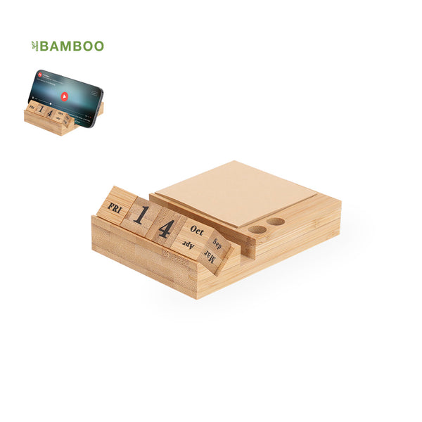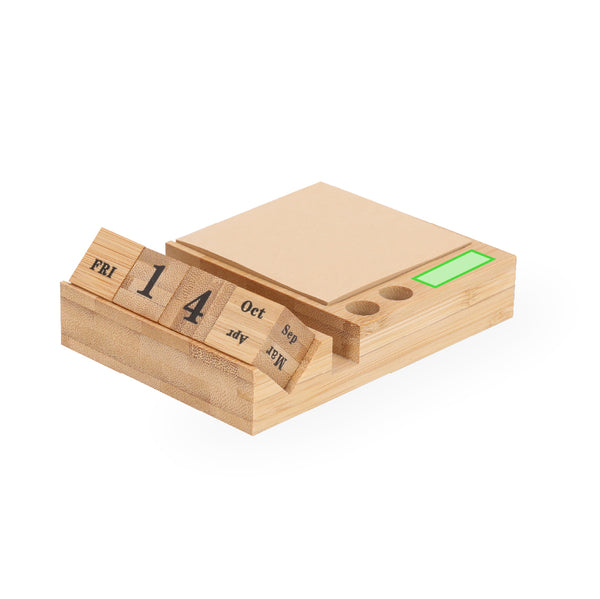 Perpetual Calendar Notepad Holder made of Bamboo. This elegant perpetual calendar features cubes that display the days of the week, months, and days of the month. It includes a smartphone holder, 100 kraft paper sticky notes, and slots for two pens. Perfect for keeping your desk organized and stylish.Materials such as Bamboo promote the use of natural raw materials, thus reducing pollutant emissions. It comes from a highly resistant and versatile plant, with rapid growth and regeneration, making it an excellent alternative to the use of traditional wood.