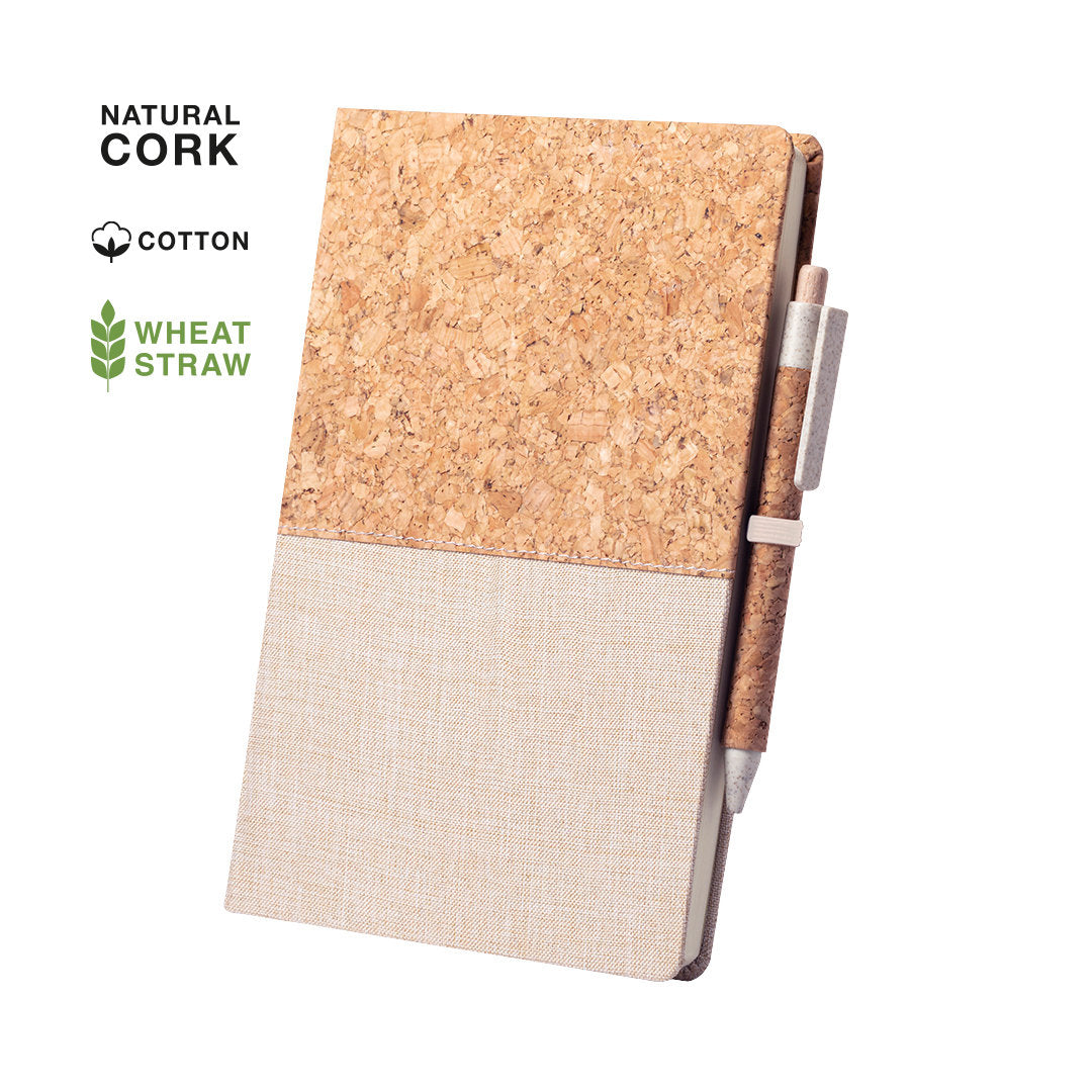 Set of notepad and ball pen in nature line. Notebook with hard covers in natural cork and cotton, with ball pen holder and 80 plain sheets. Ball pen with push-up mechanism, with natural cork body and accessories in wheat straw, to encourage the use of natural raw materials and reducing contaminant emissions. Black ink.