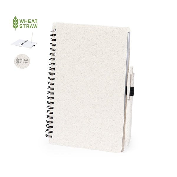 Set of notebook and pen. Ring notebook with wheat straw covers and pen holder. 80 sheets with eco design and single-stripe layout. Push-button mechanism ball pen with wheat straw barrel and blue ink. With Wheat Straw logo. Presented in an individual recycled bag.Made with vegetal elements to encourage the use of natural raw materials and reduce pollutant emissions.