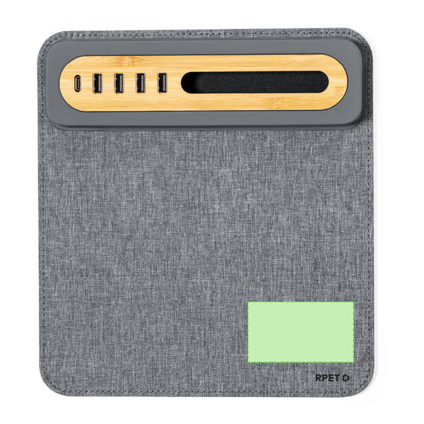 Stylish and functional mouse pad made of a combination of soft RPET polyester and bamboo. With Type-C port and four USB 2.0 ports, for easy connection and charging of devices. With smartphone holder and non-slip base for comfortable and stable use. Bring a new era of connectivity and sustainability to your workspace.Presented in an individual kraft design box and in a recycled bag.RPET material is made from recycled plastic to encourage the reuse of plastic waste and help the sustainability of the planet.