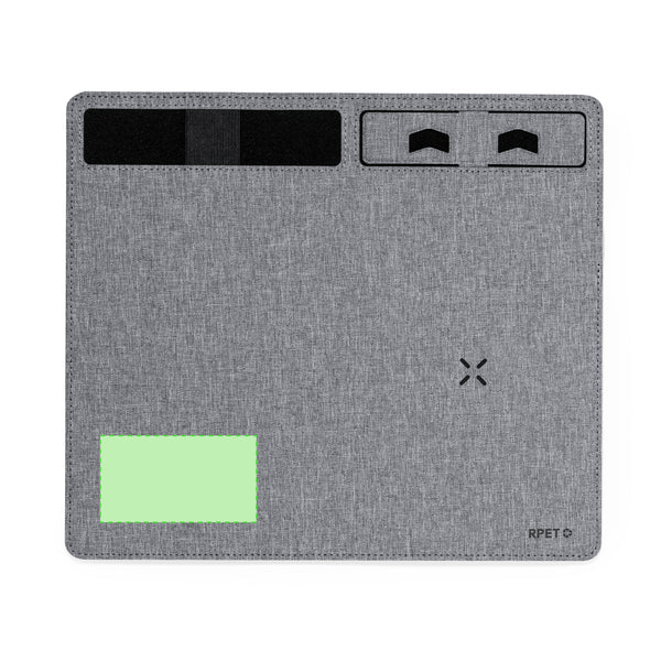 Stylish and functional mouse pad made of soft RPET polyester. With Type C input - black Type C cable included - and 15W wireless charger, compatible with devices equipped with Qi wireless charging technology. Including smartphone holder and ball pen holder. With non-slip base that guarantees stability and comfort in use. Includes instructions manualin English and Spanish. Presented in an individual kraft design box and in a recycled bag.RPET material is made from recycled plastic, thus promoting the reuse of plastic waste and helping the sustainability of the planet.Manufactured according to RoHS standards and in compliance with the following safety requirements: Overheating protection system. Over-charge protection system. Blocking system to prevent short circuits.