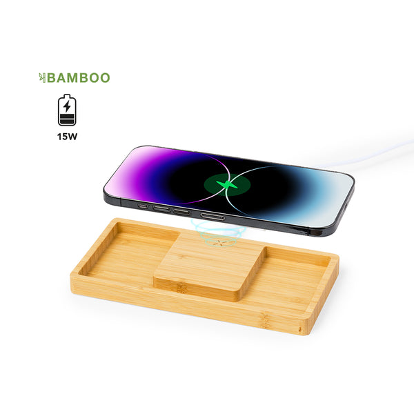 Wireless charger and organiser 15W, made of bamboo. With smartphone holder function and extra compartments for objects, compatible with devices equipped with wireless charging technology. Large branding surface and presented in an individual kraft box. Instructions manualin English and Spanish available.Materials such as bamboo encourage the use of natural raw materials, reducing pollutant emissions. It comes from a highly resistant and versatile plant with rapid growth and regeneration, making of it an excellent alternative to traditional wood.Manufactured according to RoHS standards and in compliance with the following safety requirements: Overheating protection system. Over-charge protection system. Blocking system to prevent short circuits.