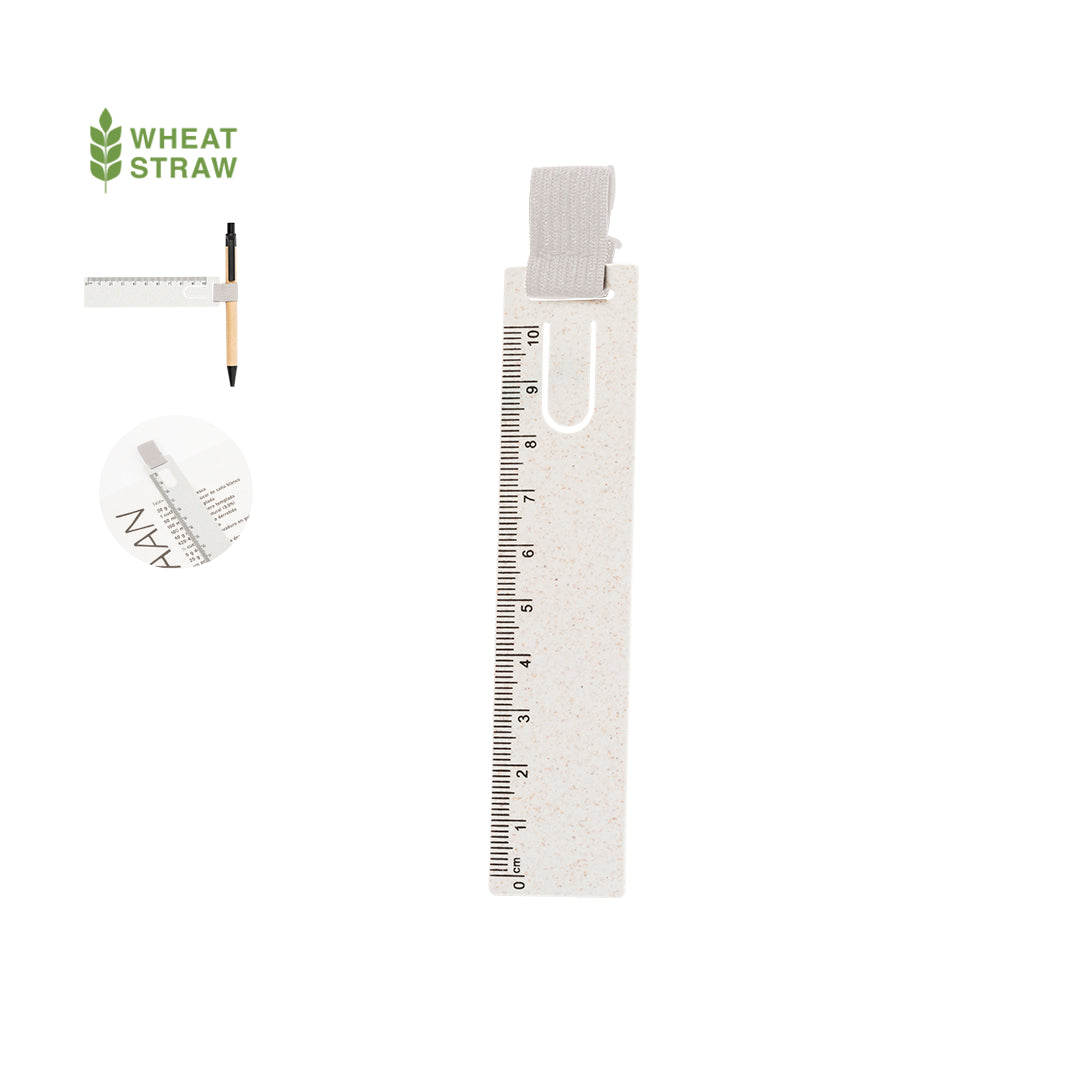 Original bookmark ruler made of wheat straw. Practical measuring utensil up to 10cm with a tab to use as a bookmark and an elastic band to hold pens. Made of wheat straw and polyester. Presented individually in a Recycled paper bag.Wheat straw promotes the use of natural raw materials, thus reducing pollutant emissions.