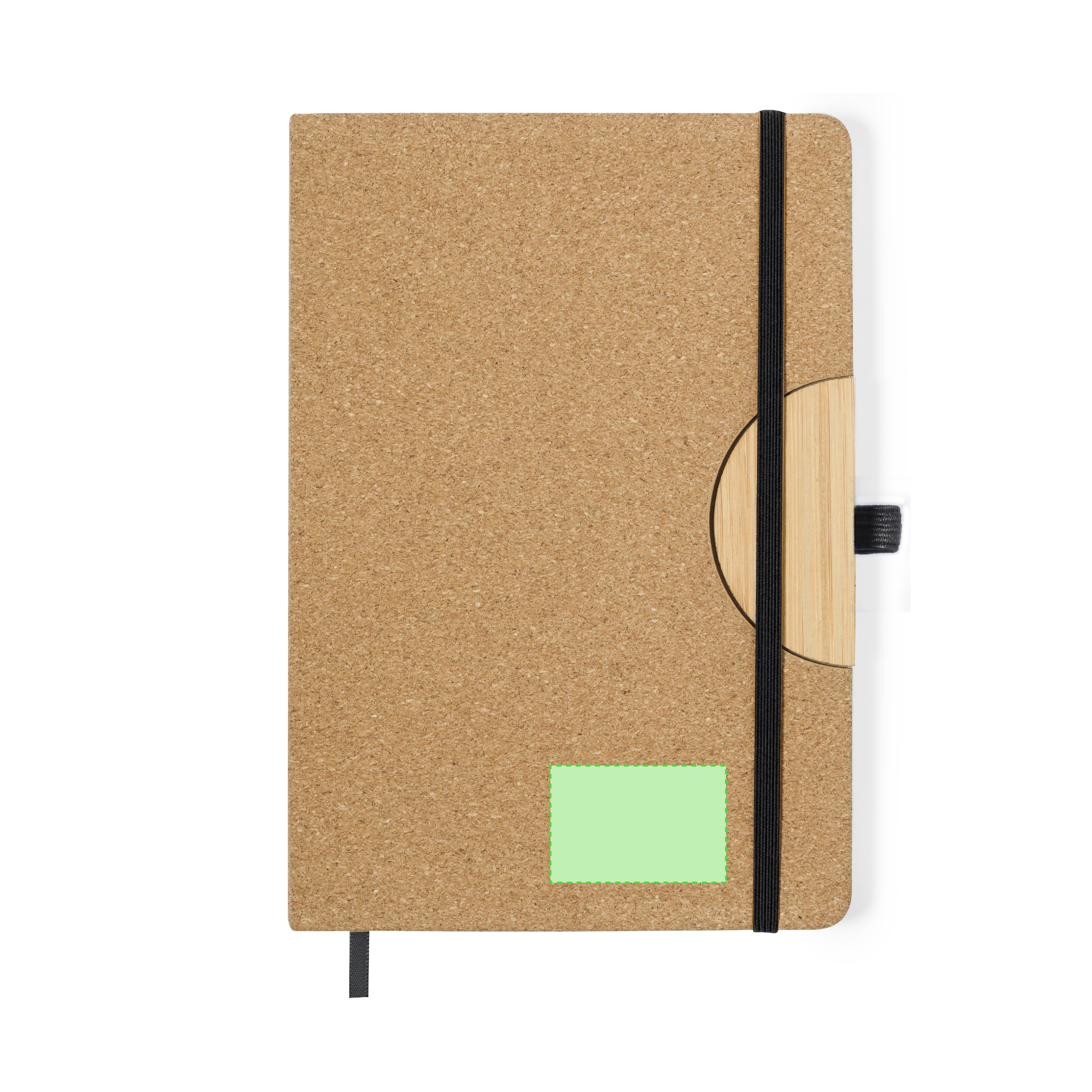Notebook with hard covers made of cork and with versatile smartphone and tablet holder integrated at the front cover. Including an elastic closure band and a matching pen holder in black color. 100 inner sheets with single-stripe layout and comes presented in individual recycled bag.Made with plant-based elements to promote the use of natural raw materials and reduce polluting emissions.