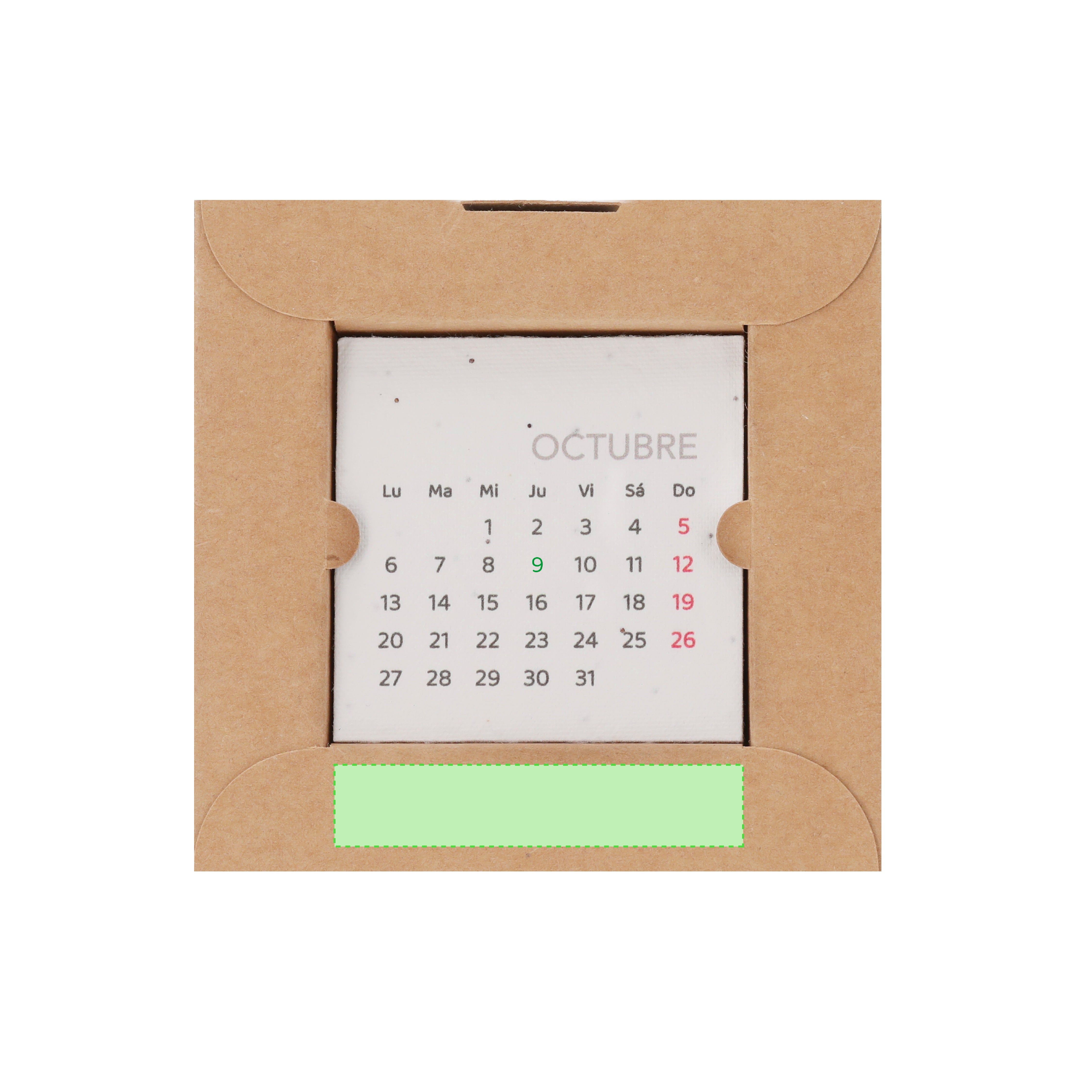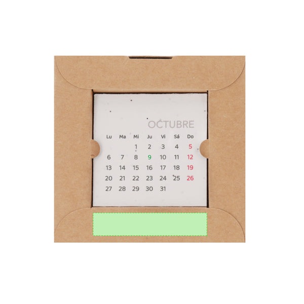 Plantable calendar made of seed paper. Including 13 sheets with petunia seeds in assorted colours, turning it into plantable paper after its lifespan. Current month design, with national holidays marked in red and regional holidays in green. Presented in a cardboard holder box.