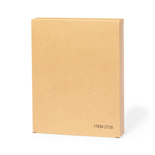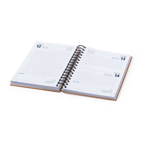 A5 size diary made of elegant and sustainable recycled leather. With hard covers and elastic closure, including recycled leather logo.Day page design, day notes area and pages with die-cut corner to mark the day. In 2 languages: Spanish and English. Presented in a kraft box. Recycled leather rescues the fibres discarded in the leather manufacturing processes, minimising the waste of material, contributing to reduce the environmental impact and, at the same time, keeping its original properties.