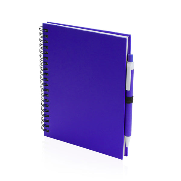 Notebook and ball pen set. Ring notebook with soft touch covers made of recycled cardboard, and matching ball pen. Includes 70 blank sheets, with pen holder. Available in a bold range of colours.