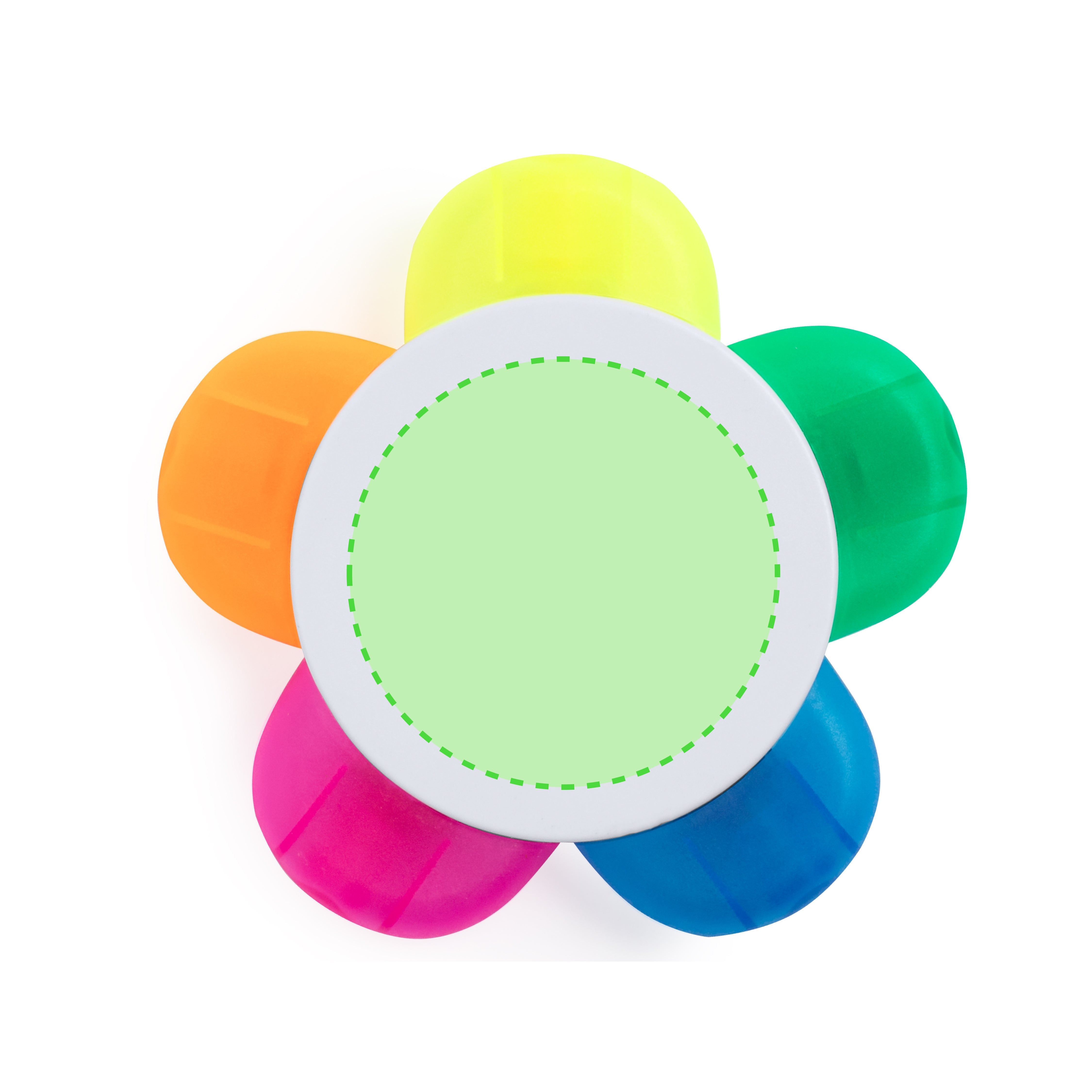 Set of markers in eye catching flower design. With wide printing area and markers in orange, blue, green, yellow and fucsia colors.