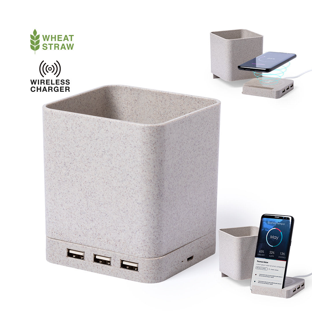 4 in 1 nature line multifunction pen holder. Manufactured in wheat straw, to encourage the use of natural raw materials and reducing contaminant emissions. With pen holder, smartphone holder, wireless charger and USB port (3xUSB 2.0) functions. Compatible with smartphones equipped with wireless charging technology. Including 1 meter long , white color micro USB cable. Presented in an attractive eco-design box. Instruction manual available in Spanish and English.