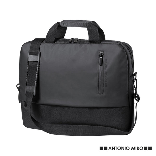 Premium quality Antonio Miro briefcase in durable 600D polyester. With a sober design and padded laptop compartment for laptops up to 15 inches. With comfortable reinforced carry handle, zip closures with metal pullers and front pocket. Brand logo at front.
