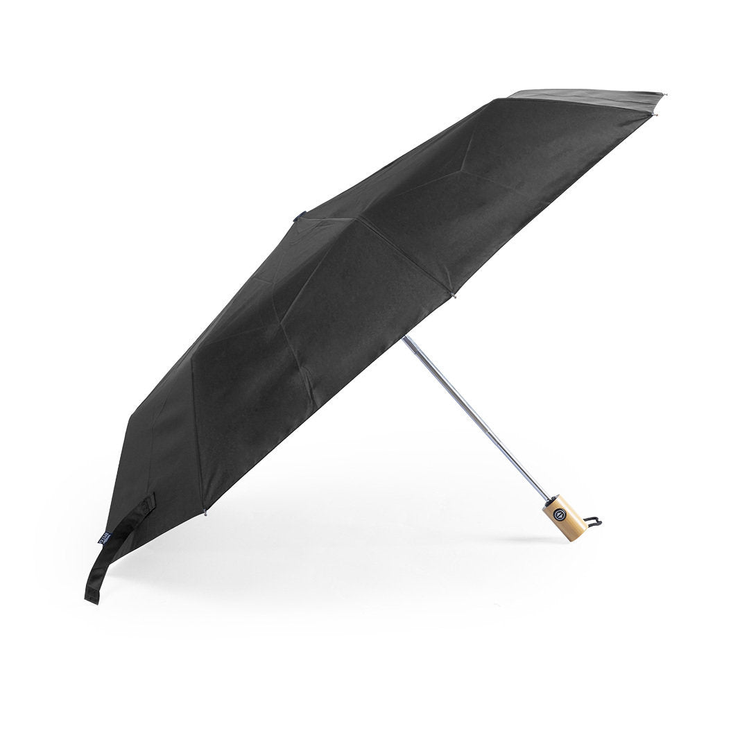 Nature line folding umbrella, 103cm in diameter. In 190T RPET pongee material made from recycled plastic, to encourage the reuse of plastic waste and help the sustainability of the planet. Automatic opening and closing, with windproof mechanism and fiberglass ribs. Bamboo handle with push button, RPET emblem on label, and available in a wide range of colours. Matching colour, RPET pouch included.