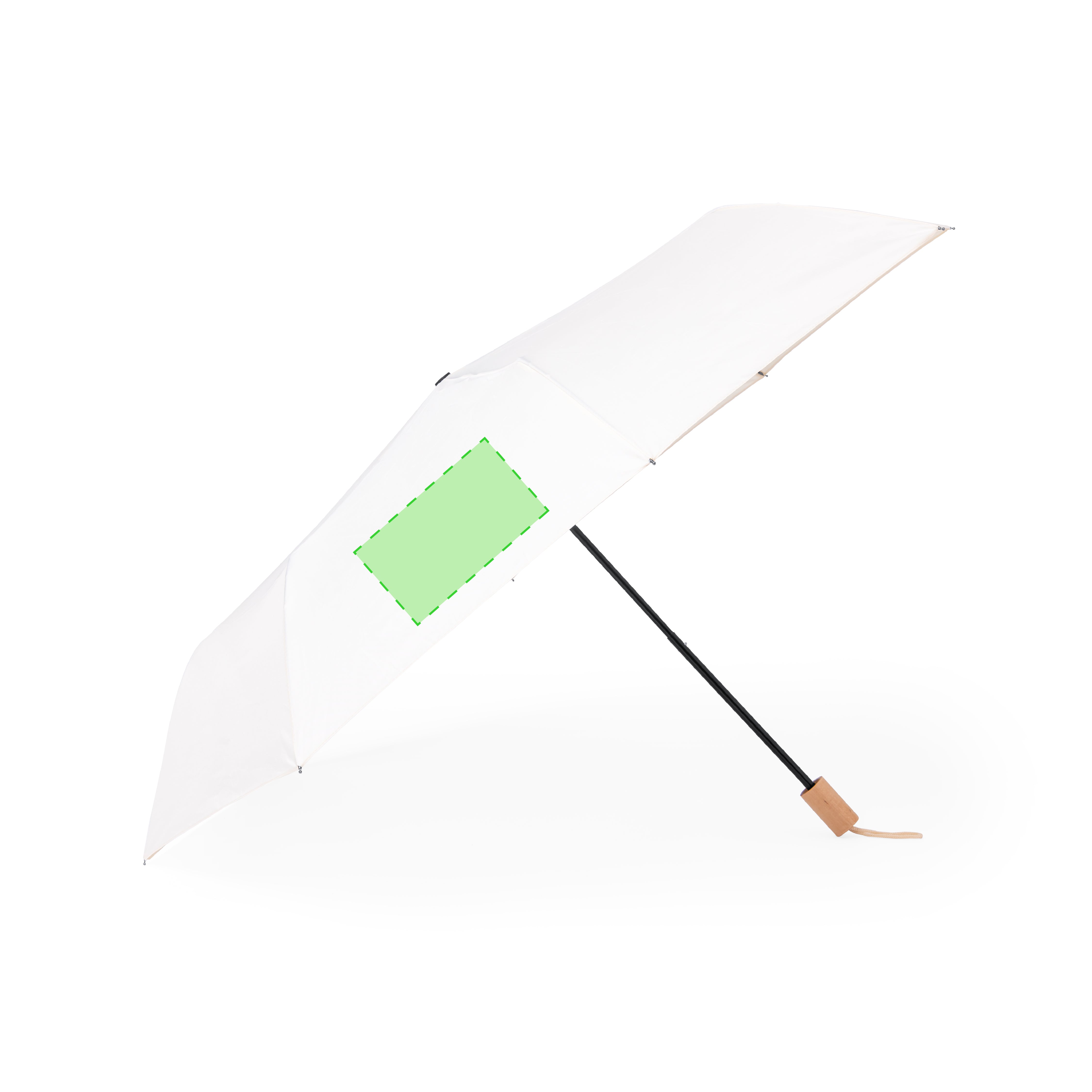 Folding umbrella with 8 panels and 106 cm diameter, made of resistant 190T pongee material with natural finish. Manual opening, with black metal ribs and a strap with velcro closure. Wooden handle with matching string and sleeve in the same material.