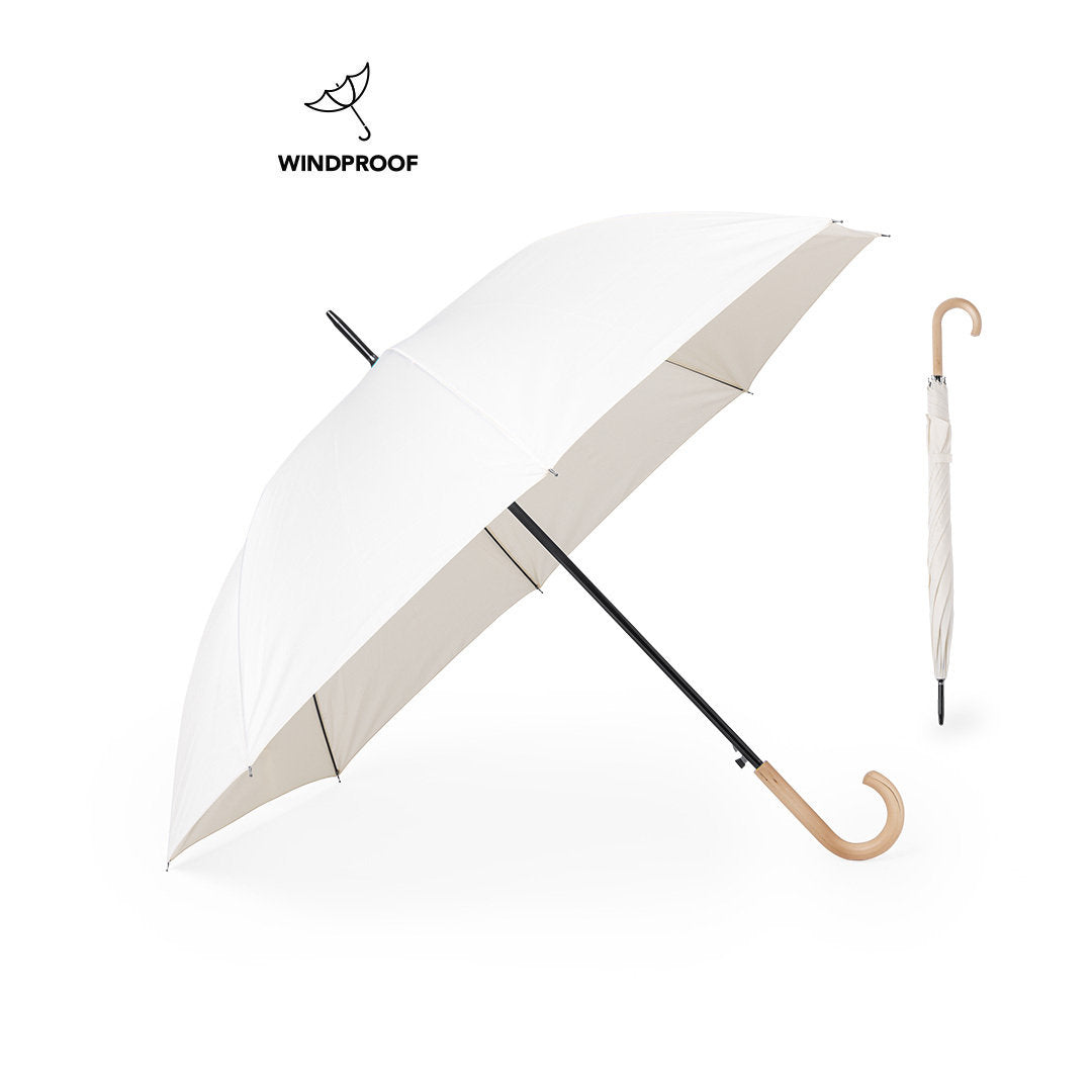 8 panel umbrella with 120 cm diameter, made of resistant 190T pongee material with natural finish. Automatic opening and windproof mechanism. With black fibre ribs, wooden handle and strap with velcro closure.