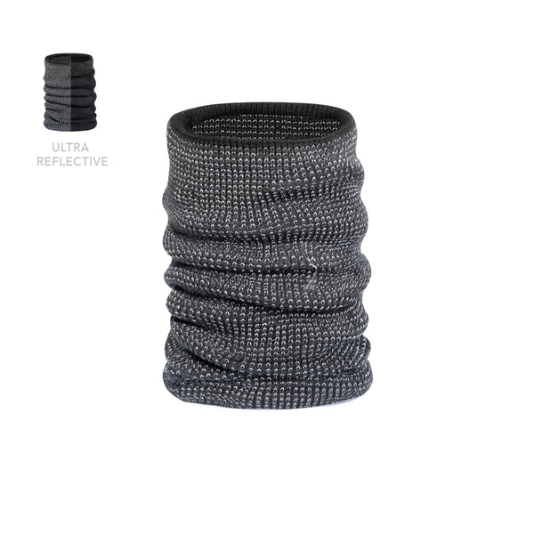 Warm reflective neck gaiter in ribbed knit, made of soft elastic acrylic material in combination with polyester, and soft polar fleece interior. Includes a reflective thread woven into the fabric to increase visibility.