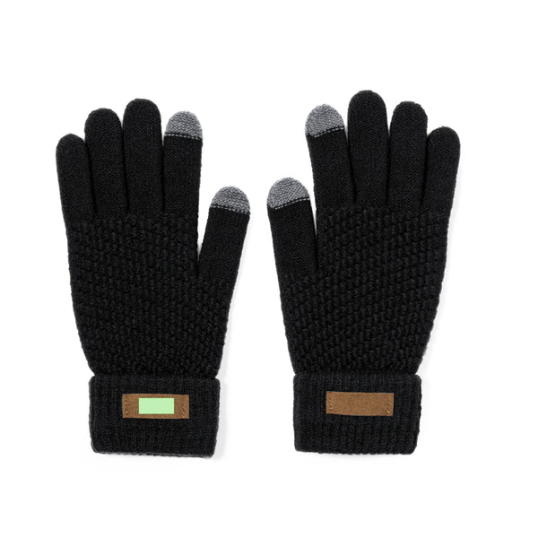 Practical pair of gloves for touchscreen devices. Made of RPET warm and soft polyester. Touch function on index finger and thumb. One size fits al for adults, with RPET label.RPET material is made from recycled plastic, thus promoting the reuse of plastic waste and helping the sustainability of the planet.