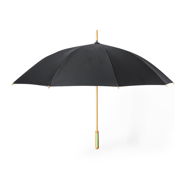 105cm diameter umbrella in 190T RPET pongee material. Manual opening and windproof mechanism, with fibreglass ribs an velcro closure. In an elegant bla colour, with straight handle made made in bamboo and RPET label.RPET material is made from recycled plastic, thus promoting the reuse of plastic waste and helping the sustainability of the planet.