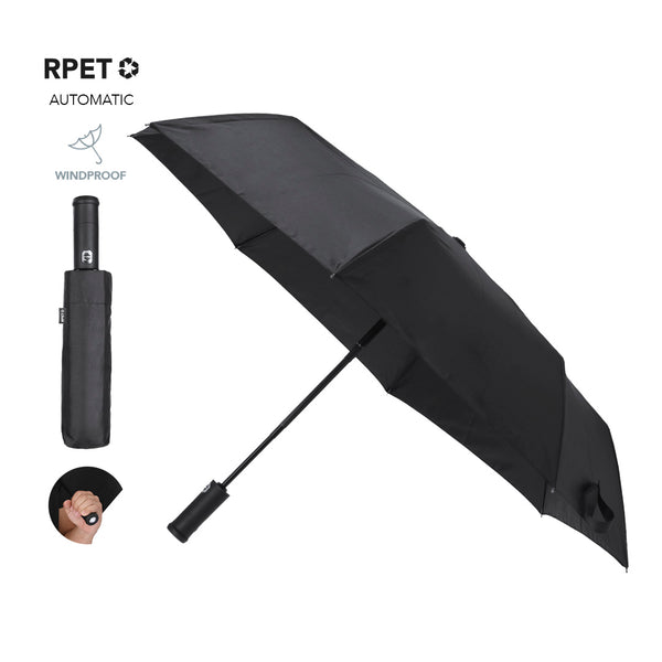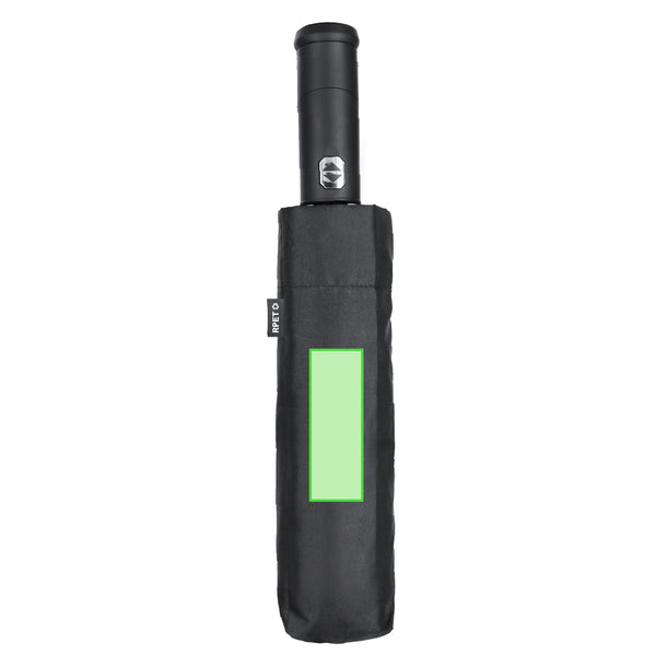 Umbrella made of RPET. With a practical 180º turning lantern handle in soft touch rubber and ON/OFF button. 105cm diameter, in 190T RPET pongee material. Automatic opening and closing, with windproof mechanism and fibreglass ribs. Label with RPET logo. Battery power supply (cell batteries included).RPET material is made from recycled plastic, thus promoting the reuse of plastic waste and helping the sustainability of the planet.