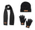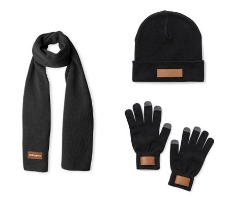 3-piece set: hat, scarf and touch gloves, ideal for providing comfort and functionality on cold days. Each piece features a brown PU stitched label, perfect for branding. Presented in an elegant black box.
