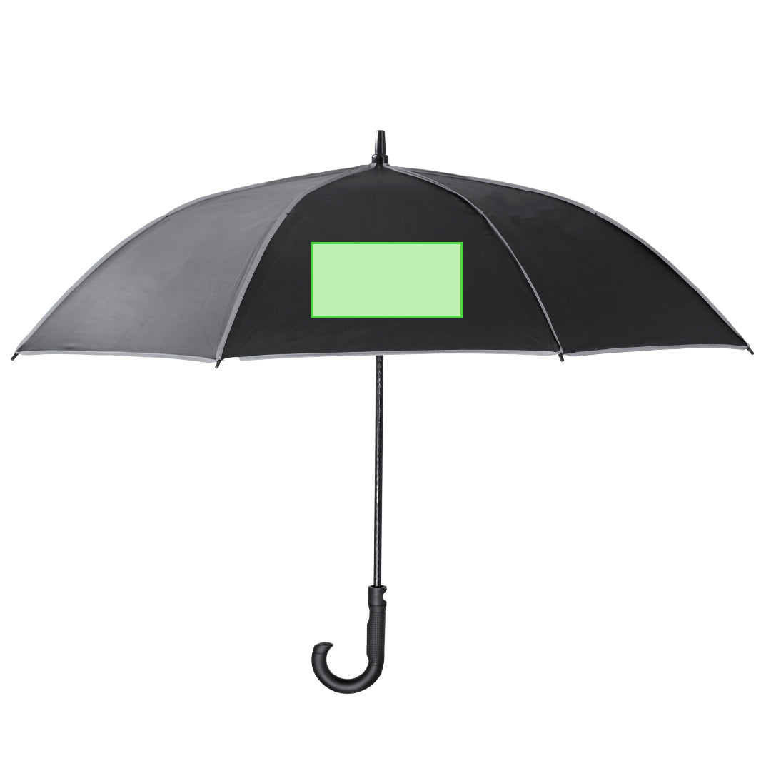 Windproof umbrella made of 8-panel RPET 190T, with an elegant design in black with reflective trim. 120cm in diameter, with automatic opening and in resistant pongee material. With black fiberglass rods, velcro closure and PP handle. Includes case with adjustable strap for easy transport and distinctive RPET label.