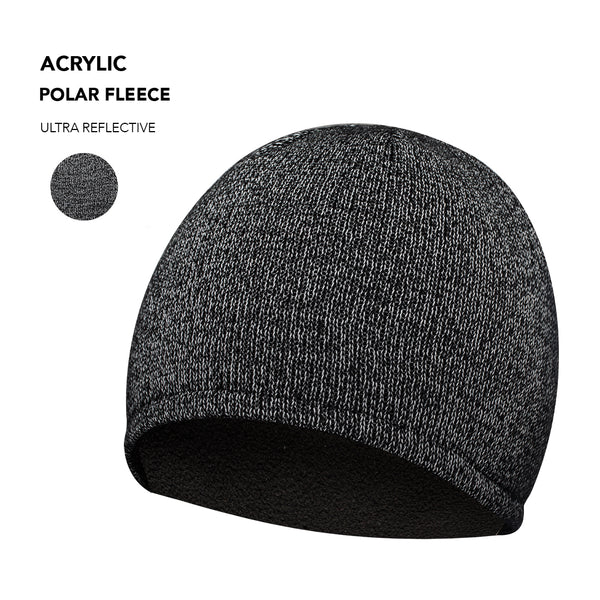 Comfy sports hat in extra reflective material. Outside in acrylic material with reflective fibers and inside in soft and warm polar fleece.