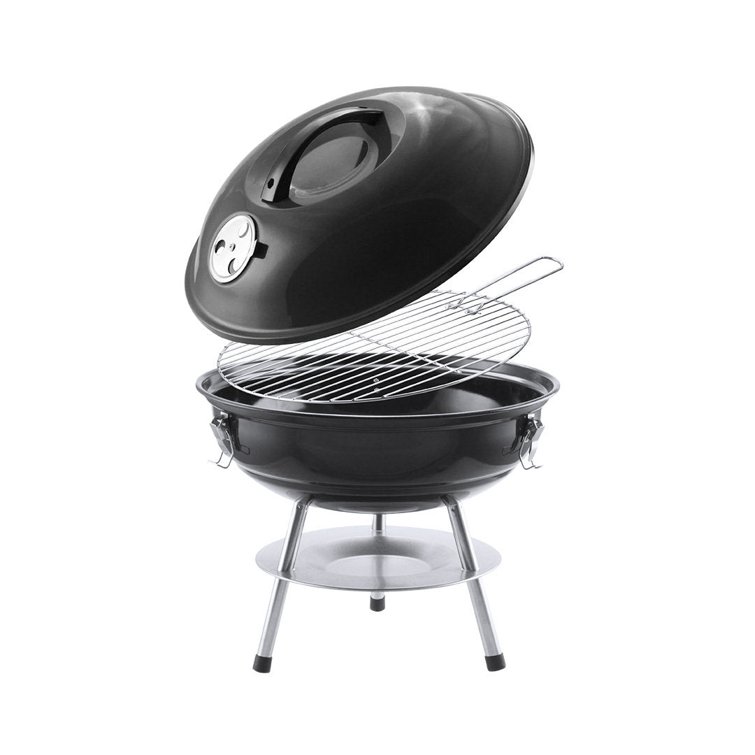 Barbecue made of resistant carbon steel with black finish. Lid with comfortable handle and ventilation holes, with metal grill, anti-drip plate and non-slip feet. Presented in an attractive design box.