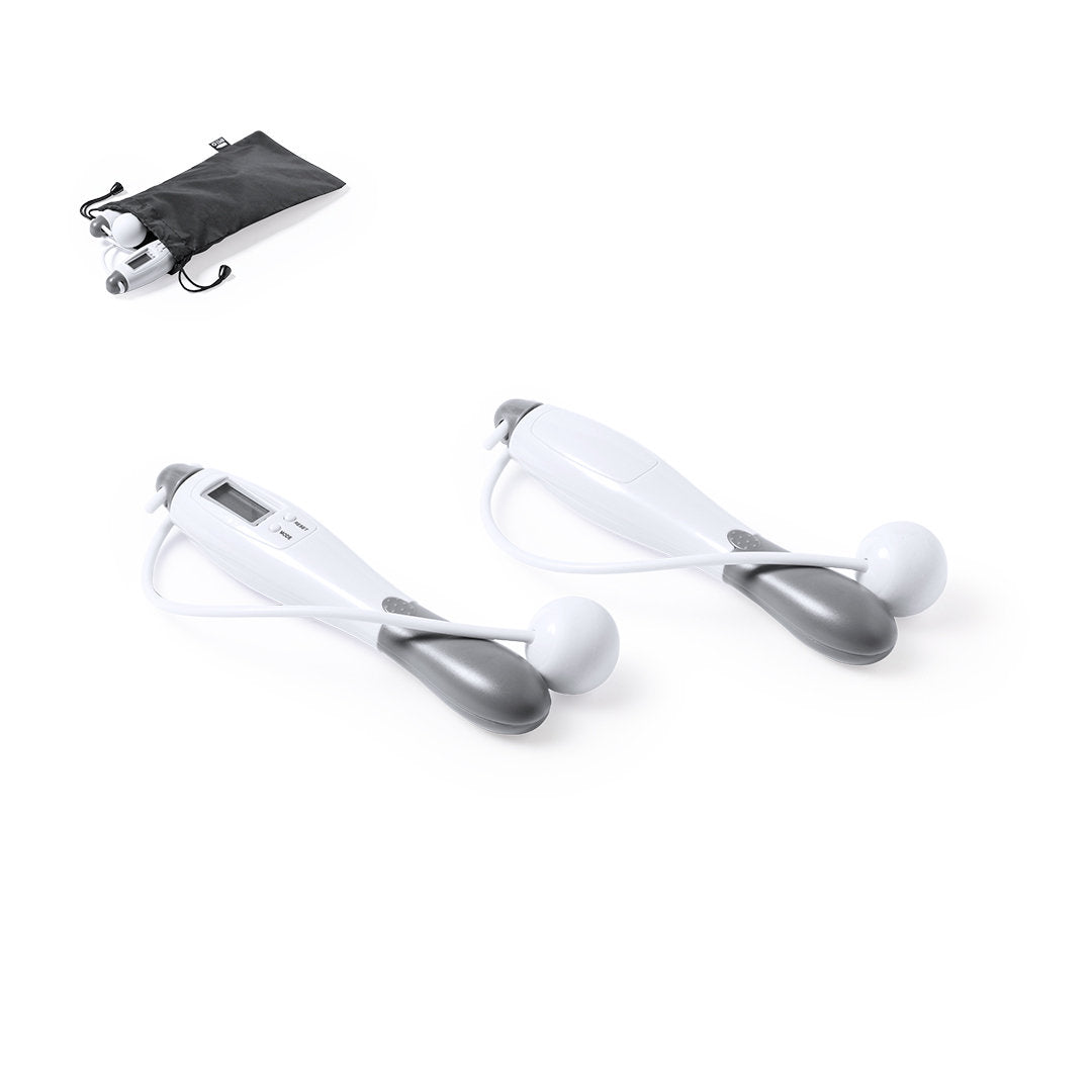 Digital jumping rope, made in resistant ABS. With ergonomic grip handles and LCD display with adjustment buttons. Presented in RPET polyester pouch with drawstring closure, made from recycled plastic to promote the reuse of plastic waste and contribute to the sustainability of the planet. Distinctive RPET label on the case. Battery powered (button cell batteries included).