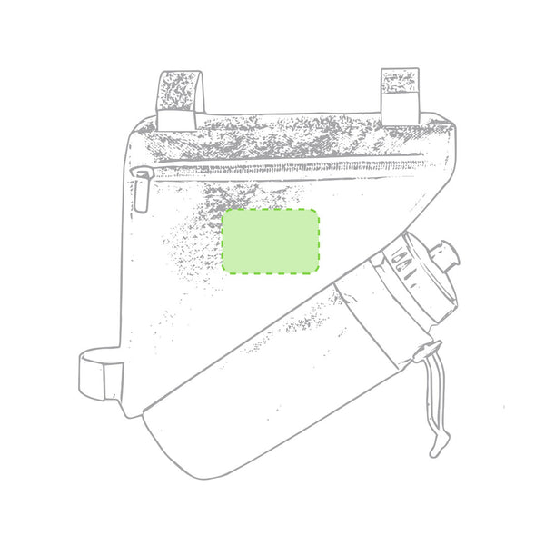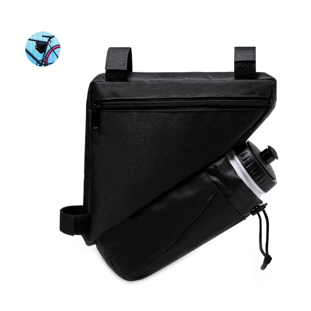 Bicycle bag in resistant 600D polyester with reinforced PVC interior. Available in black color. Main compartment with zip and universal adjustment to the bicycle frame by means of 3 velcro strips. Water bottle compartment with adjustable string.