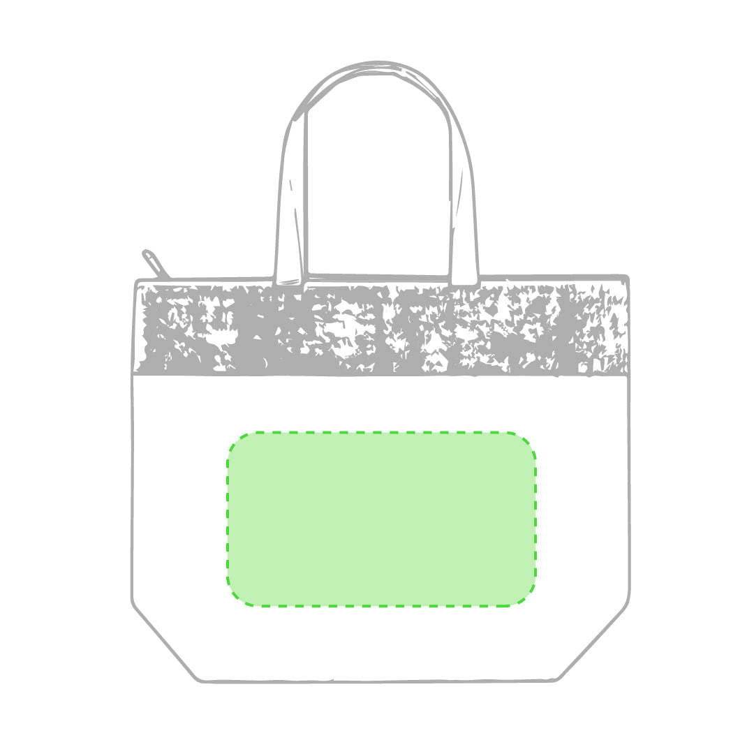 Thermal bag in resistant cotton material 225g/m2, with top side in laminated jute and including cotton handles. Main compartment with zip and metal puller, with aluminium isothermal interior. Stitched finish, with medium sized reinforced handles and resistance up to 7kg in weight.