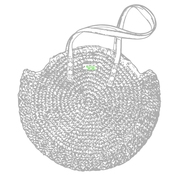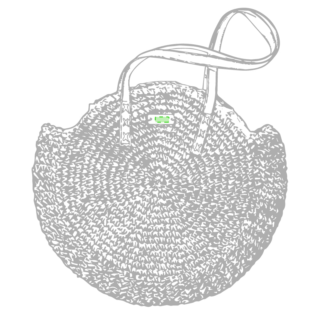 A must-have bag with a casual design in synthetic raffia and round shape. Main compartment with zip closure and metal puller, with pocket inside. Inside lining and long handles in PU, with triple reinforcement in X and surface for branding in wood, specially designed for laser engraving.