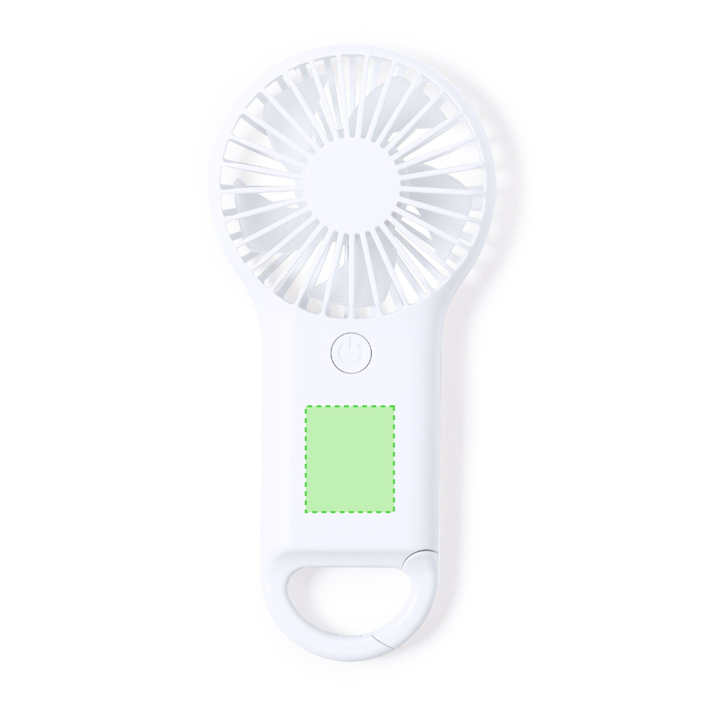 Fan made of resistant ABS in white colour, with integrated carabiner. With 2 operating speeds and presented in an individual box with kraft design. Battery powered (3xAAA not included).