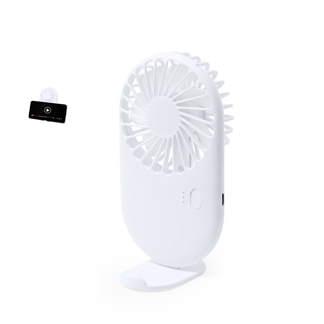 Portable fan made of durable ABS. With three speeds and integrated smartphone holder. Powered by a 300 mAh battery, with charge level indicator lights and Micro USB cable included. Presented individually in a kraft design box.