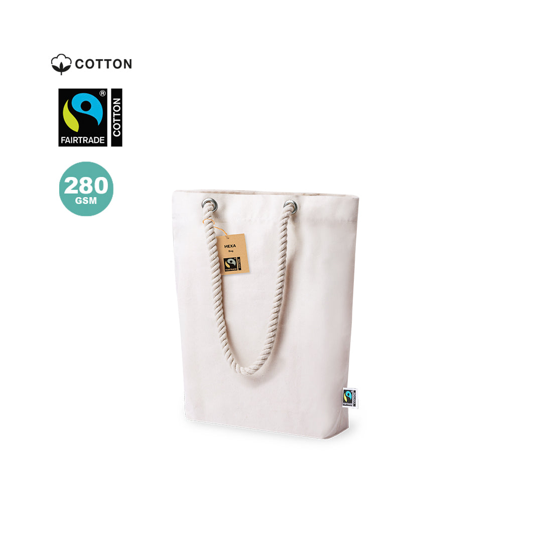Fairtrade line bag, made in cotton of 280g/m2 and in natural colour. Stitched finish, with rope style handles and reinforced with eyelets. Resistance up to 10 kg, including Fairtrade label and hangtag in recycled cardboard. With Fairtrade certification, an alternative to the conventional trade system that pursues the development of peoples and the fight against poverty.