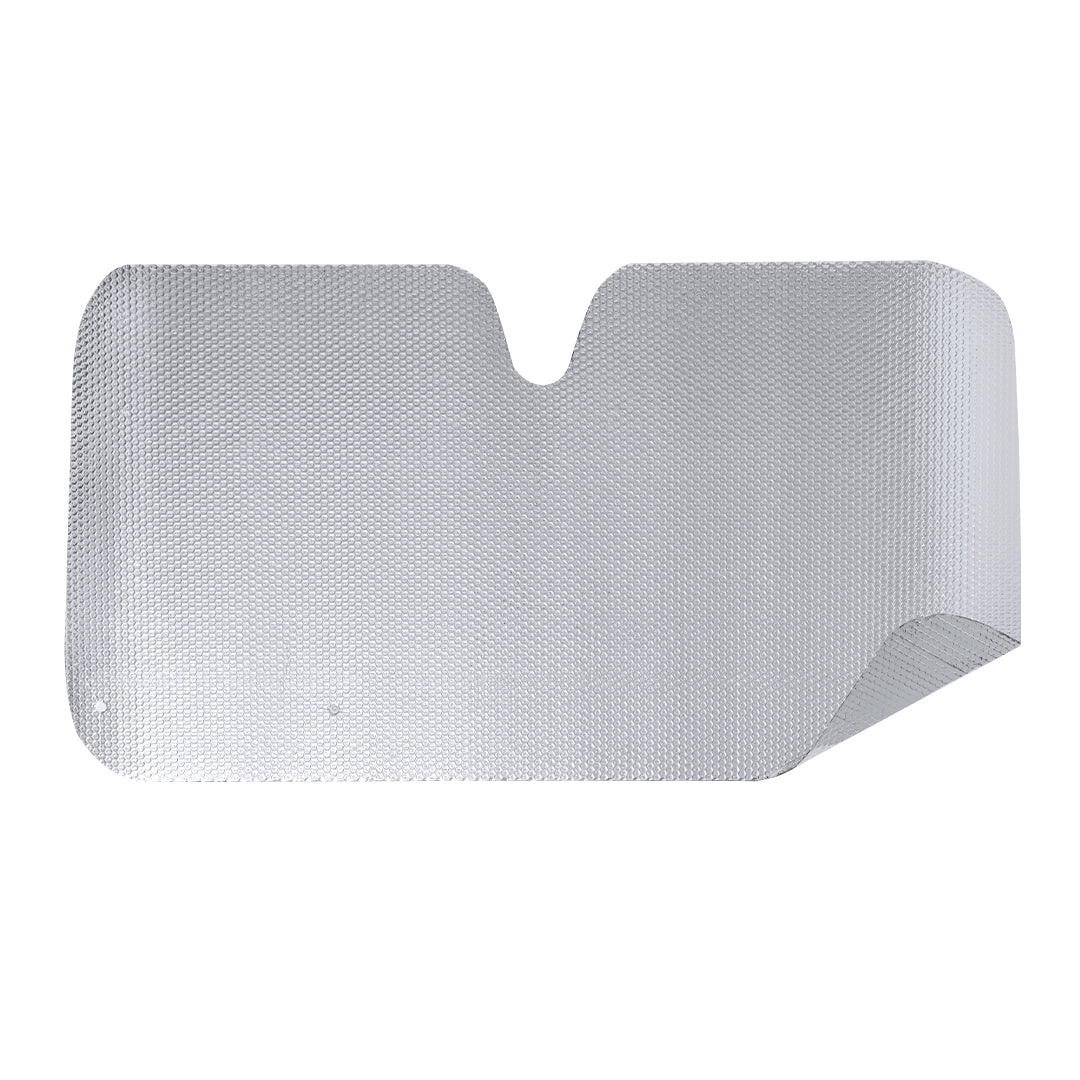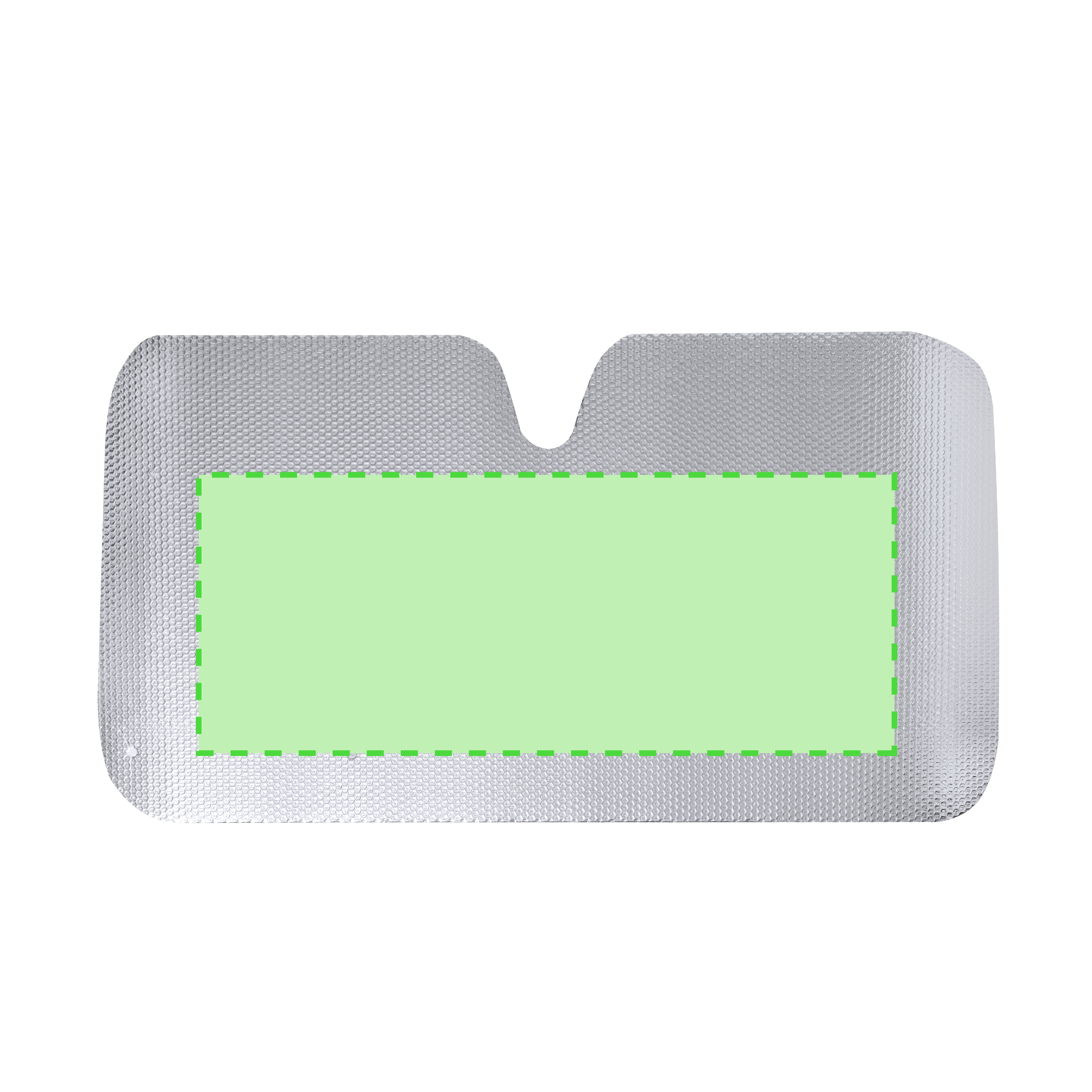Aluminium sunshade with bubble on both sides and size 130x70 cm. Metallic silver finish, with original design without piping. Easily and quickly foldable, with button closure. Presented unfolded flat for an optimal printing, with separated bags.