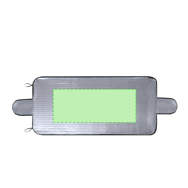 Durable single-sided Aluminium sunshade, designed to be positioned on the outside of the front window and as protection against adverse weather conditions like snow.. Including two side flaps to fit between the frame and the vehicle doors, providing additional insulation to the front window. Roll-up and with elastic bands for an easy storage, and presented in an individual recycled bag.