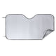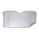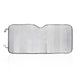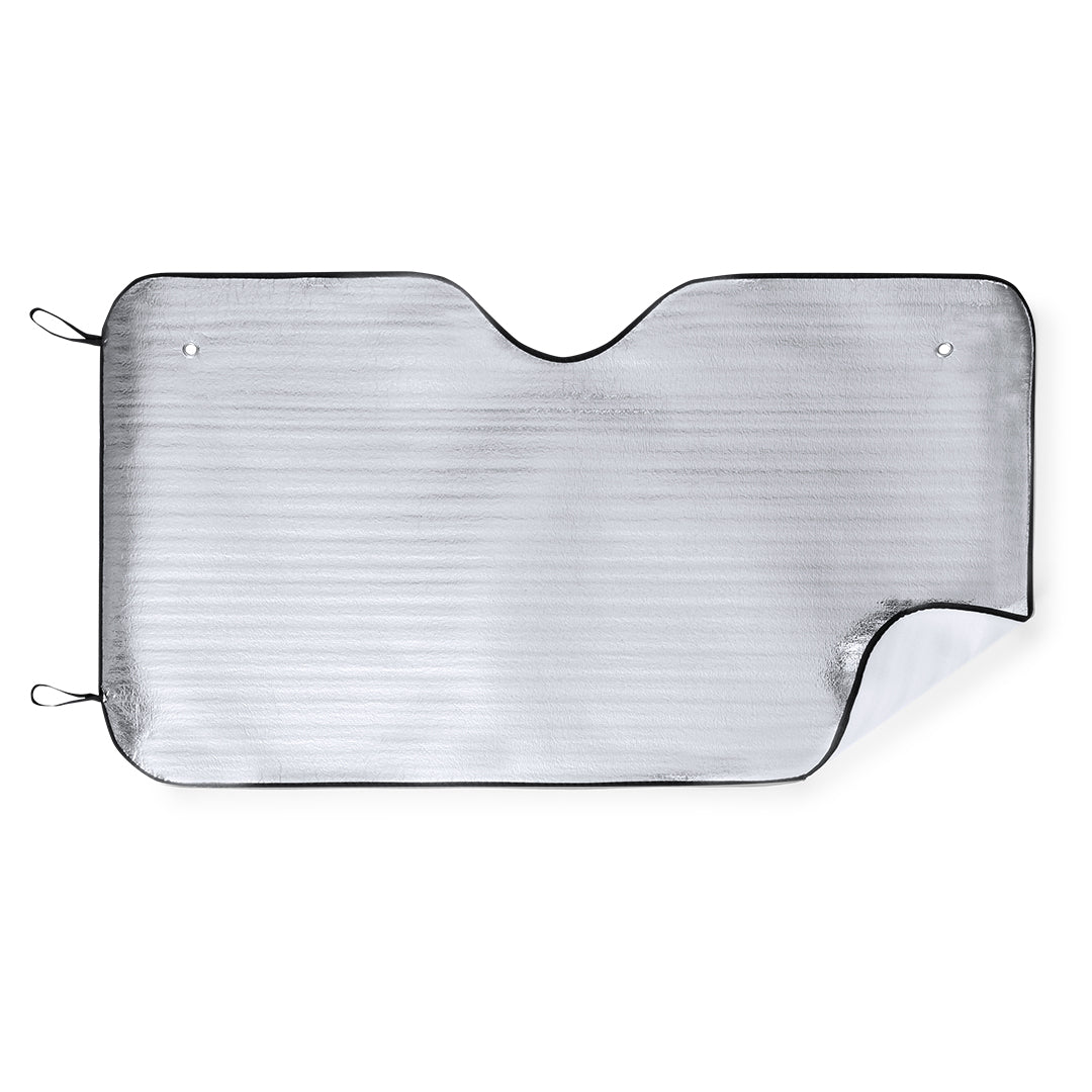 Sunshade in aluminum on one side in silver color with a metallised finish and black polyester piping. Size 130x70cm and foam on the back. Elastic folding ribbons with metal reinforcement rings, two suction cups for adjustment and presentation unfolded for easy printing.