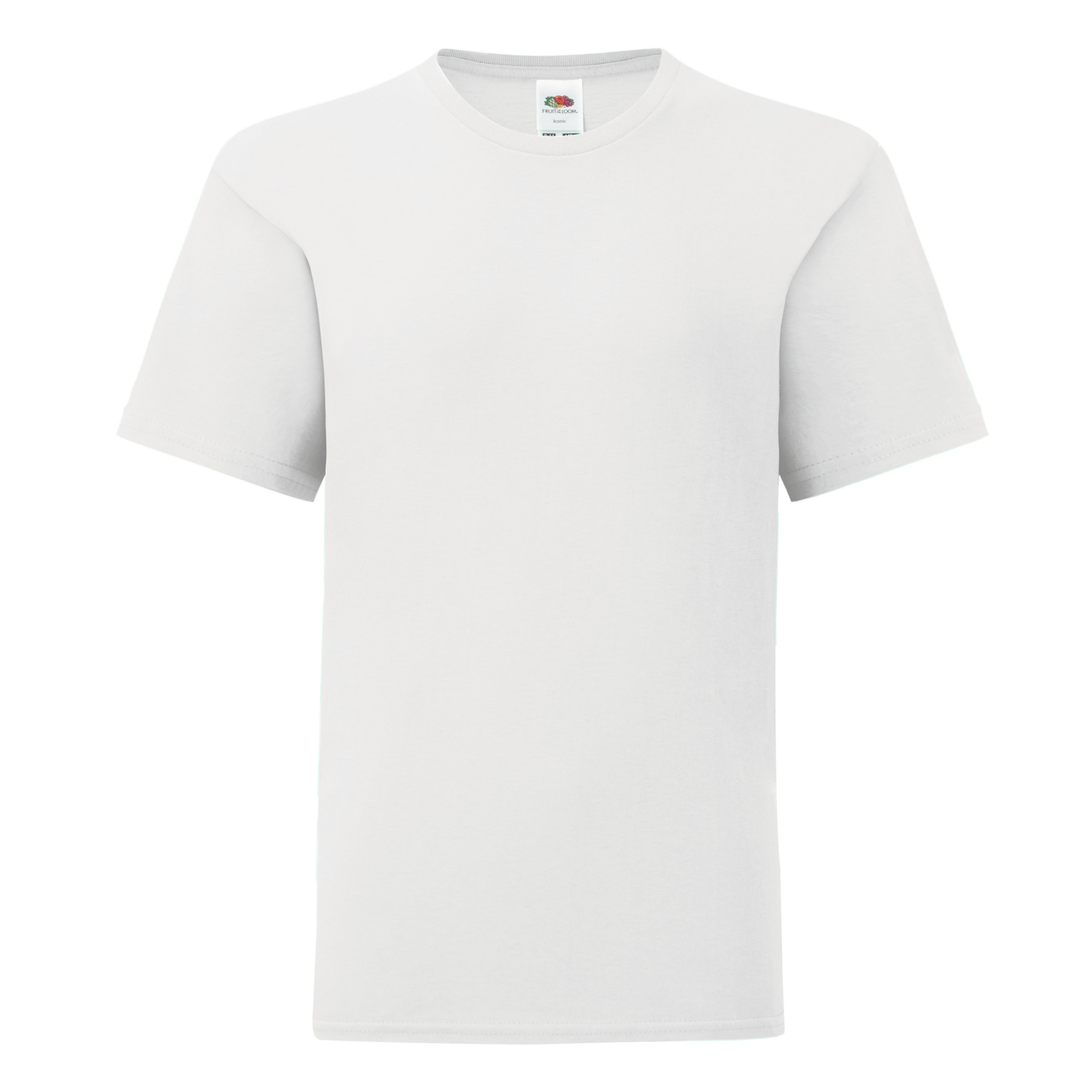 Boy white Iconic T-shirt by Fruit Of The Loom. Made in 100% brushed cotton Ring Spun 140g/m2. Soft touch and classic fit, with narrow 1x1 ribbed crew neck and matching placket. Easily removable label and available in sizes 3-4, 5-6, 7-8, 9-11, 12-13, 14-15.