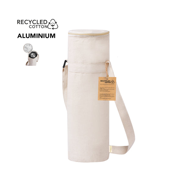 Thermal bag designed to carry bottles up to 1.5L, made in recycled cotton. It is closed with a zip and worn comfortably with the adjustable shoulder strap, in natural tone. The inside is lined with isothermal Aluminium material and has a recycled cotton label. Presented individually in a recycled bag.