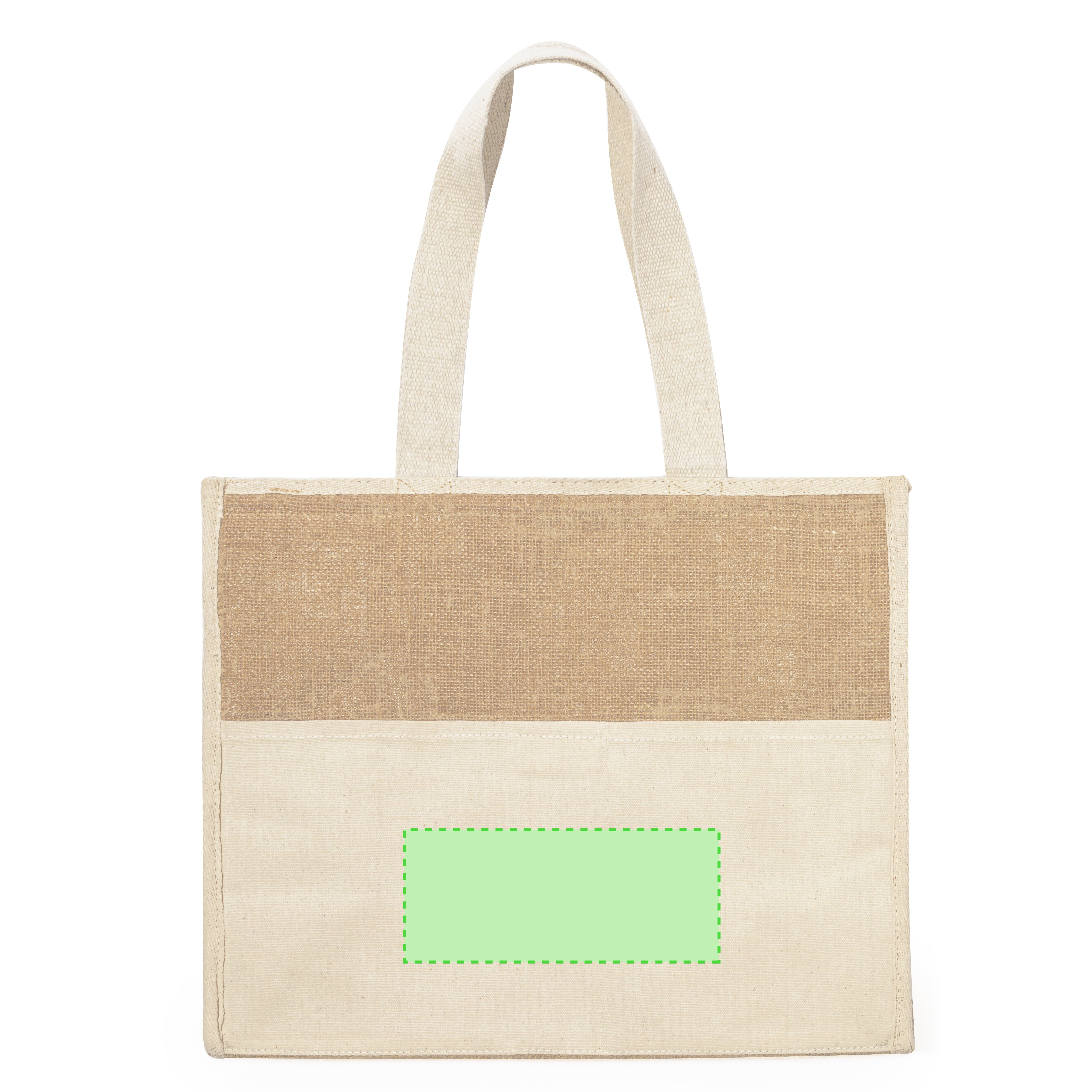 Cooler made in combination of cotton and laminated jute, with isothermal Aluminium inside. With velcro closure, large front pocket and cotton handles with reinforcement. Available in natural colour and presented in an individual bag.