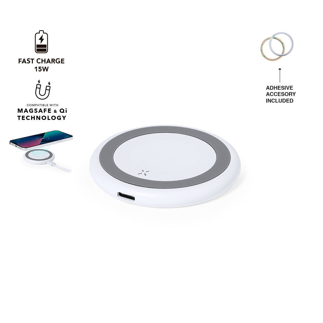 15W wireless charger with round design. Non-slip base and compatible with devices equipped with Qi charging technology. Designed for charging smartphones, headphones and smartwatches. Presented in an attractive kraft design box. Manual available in English and Spanish.