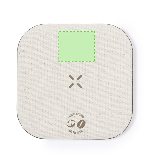 Wireless charger made of coffee fibre and recycled cotton. Non-slip base and compatible with devices equipped with Qi charging technology. Charging capacity of 15W, with Type C cable included in black color. Coffee fibre and recycled cotton logo. Presented in an attractive kraft design box, with instruction manual in English and Spanish.Coffee fibre is a circular solution that is obtained from the use of the waste produced in the production of coffee. A sustainable alternative that favours the reduction of the use of plastics, saving energy in its manufacturing process and contributing to the care of the environment. GRS (Global Recycled Standard) certification is available, which guarantees the recycled origin of the material used to manufacture the product.