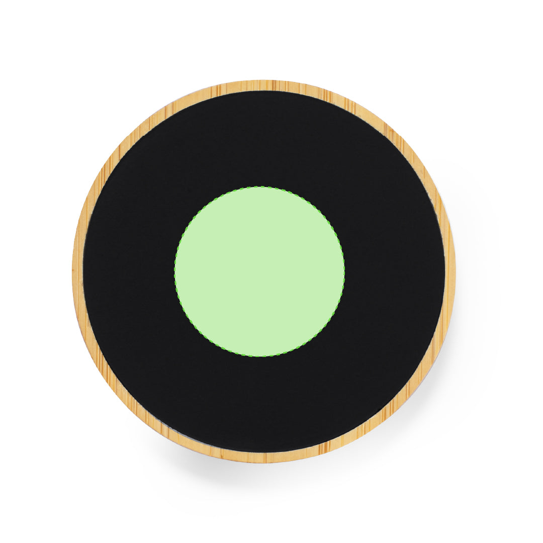 Round wireless charger. Made of bamboo, with elegant black surface. Inner LED light and outer coating specially designed for laser engraving, lighting up the logo. With 15W charging function, compatible with devices equipped with Qi wireless charging technology. With non-slip base, including Type C charger cable and instruction manual in English and Spanish. Presented in an individual kraft design box.