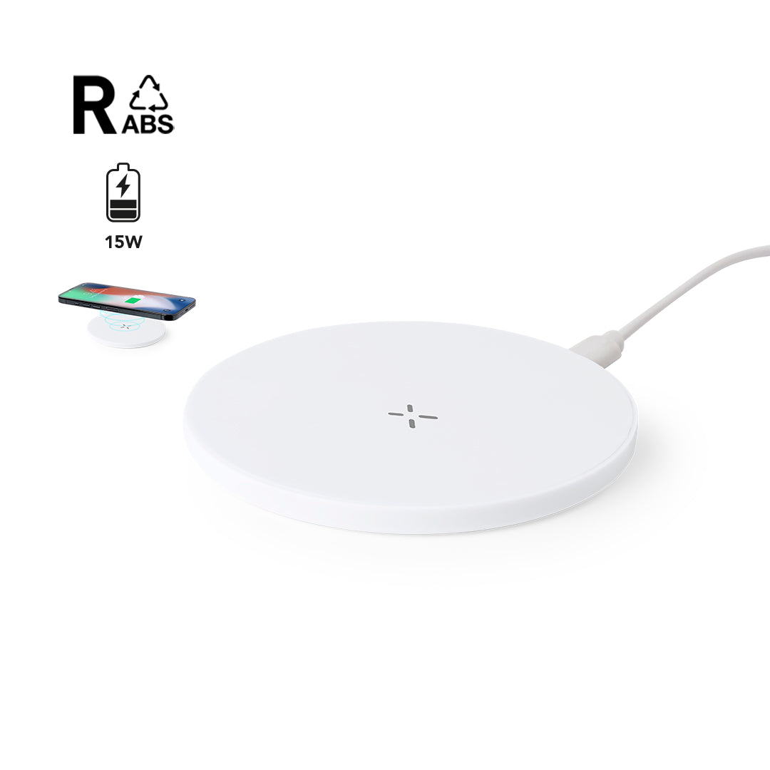 Wireless charger 15W in circular design made of RABS. Compatible with devices equipped with Qi wireless charging technology. Non-slip base, with Type C charger cable included. Presented in an individual kraft design box, with instructions manualin English and Spanish.RABS is a highly recyclable and highly resistant plastic with a multitude of applications that make of it an eco-friendly solution. With RCS certification, guaranteeing its recycled origin.Manufactured according to RoHS standards and in compliance with the following safety requirements: Overheating protection system. Over-charge protection system. Blocking system to prevent short circuits.