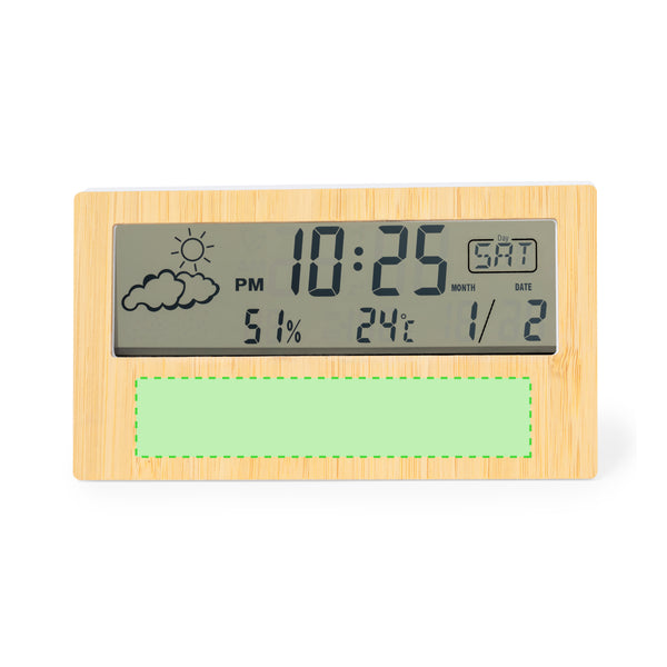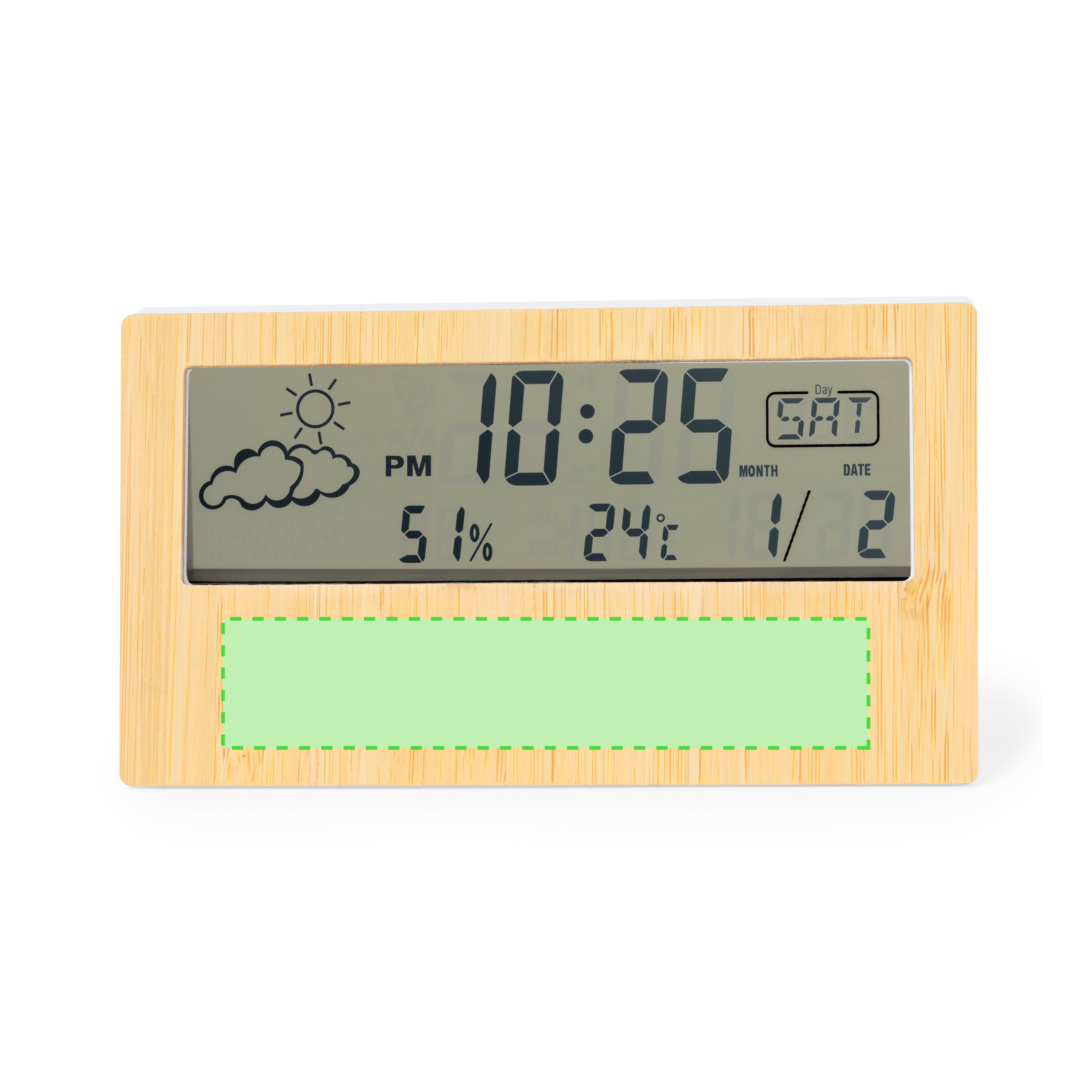 Weather station with bamboo face. With temperature and humidity sensor, calendar, and alarm function. Battery powered (1xAAA not included) and presented in an attractive kraft design box. Instruction manual available in English and Spanish.Materials such as bamboo encourage the use of natural raw materials, reducing pollutant emissions. It comes from a highly resistant and versatile plant with rapid growth and regeneration, making of it an excellent alternative to traditional wood.