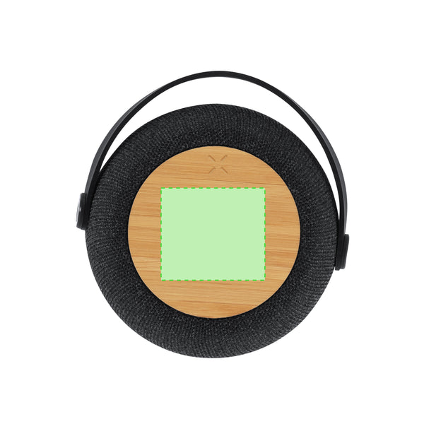Bluetooth® Speaker Charger with 15W Wireless Charging madre from RPET and bamboo. It features an lighting system with 12 LEDs that synchronize with the rhythm of your music, creating vibrant atmospheres. It includes a soft and practical silicone handle for easy transport and RPET logo.RPET material is made from recycled plastic, thus promoting the reuse of plastic waste and helping the sustainability of the planet.Materials such as Bamboo promote the use of natural raw materials, thus reducing pollutant emissions. It comes from a highly resistant and versatile plant, with rapid growth and regeneration, making it an excellent alternative to the use of traditional wood.