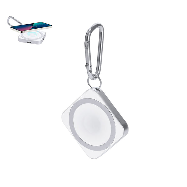 15W wireless charger made of aluminium. Designed for charging smartphones, earphones and smartwatches. With magnetic attachment. It includes metal carabiner for transport. Type C connection.