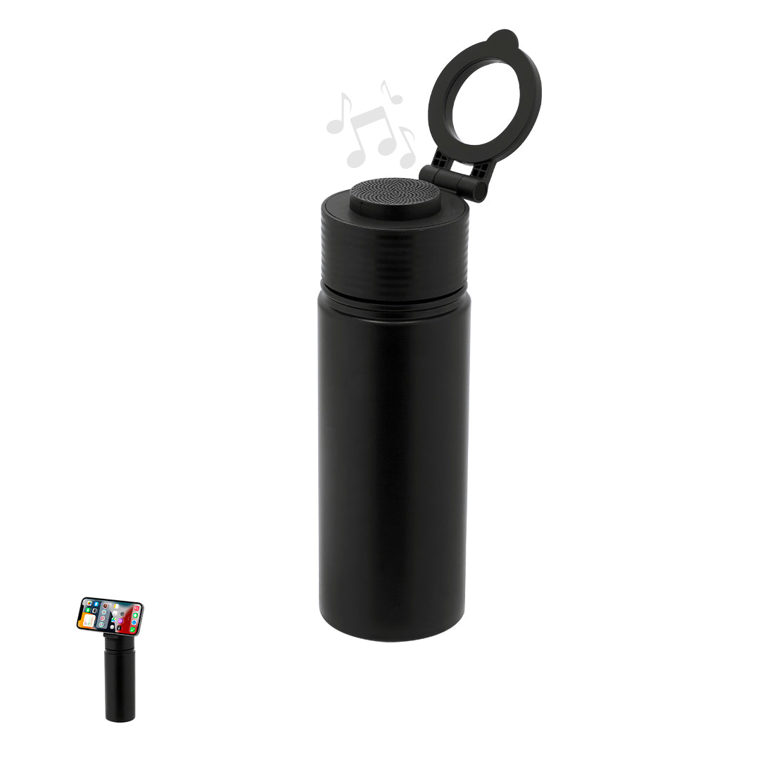 Thermal bottle with integrated Bluetooth® 5.4 speaker of 3W. With 500 ml capacity and made from double-walled stainless steel, ensuring maximum durability and excellent beverage temperature maintenance, whether cold or hot. Lid with screw closure and free of BPA, and includes an adjustable grip for smartphone with MagSafe technology. The integrated Bluetooth speaker with a 600 mAh battery in the cap is easily removable thanks to its screw system.