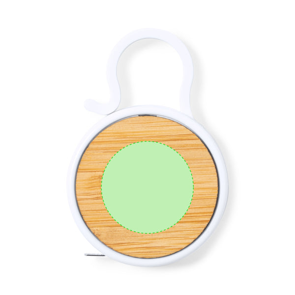 1 m flexometer in resistant white ABS, with bamboo insert on the body and transport ring. With wide branding surface and blade with measurements in centimetres and inches.
