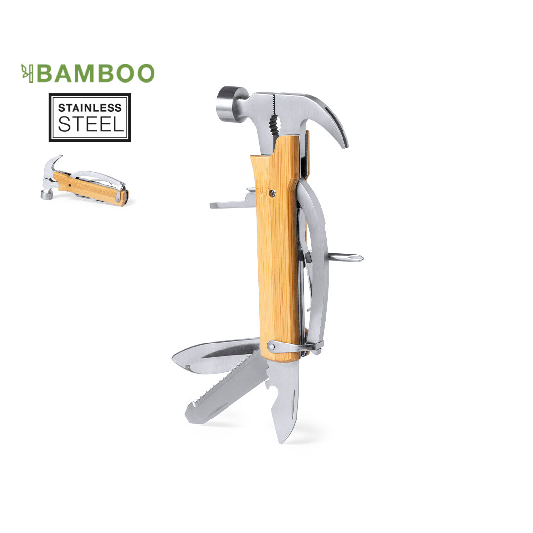 Nature line multitool with resistant body in stainless steel and bamboo handle. With 13 functions, including hammer and nail puller knife and nail clipper flat and phillips screwdriver file opener and pliers. Matching PU strap and presented in an individual box with kraft design.
