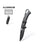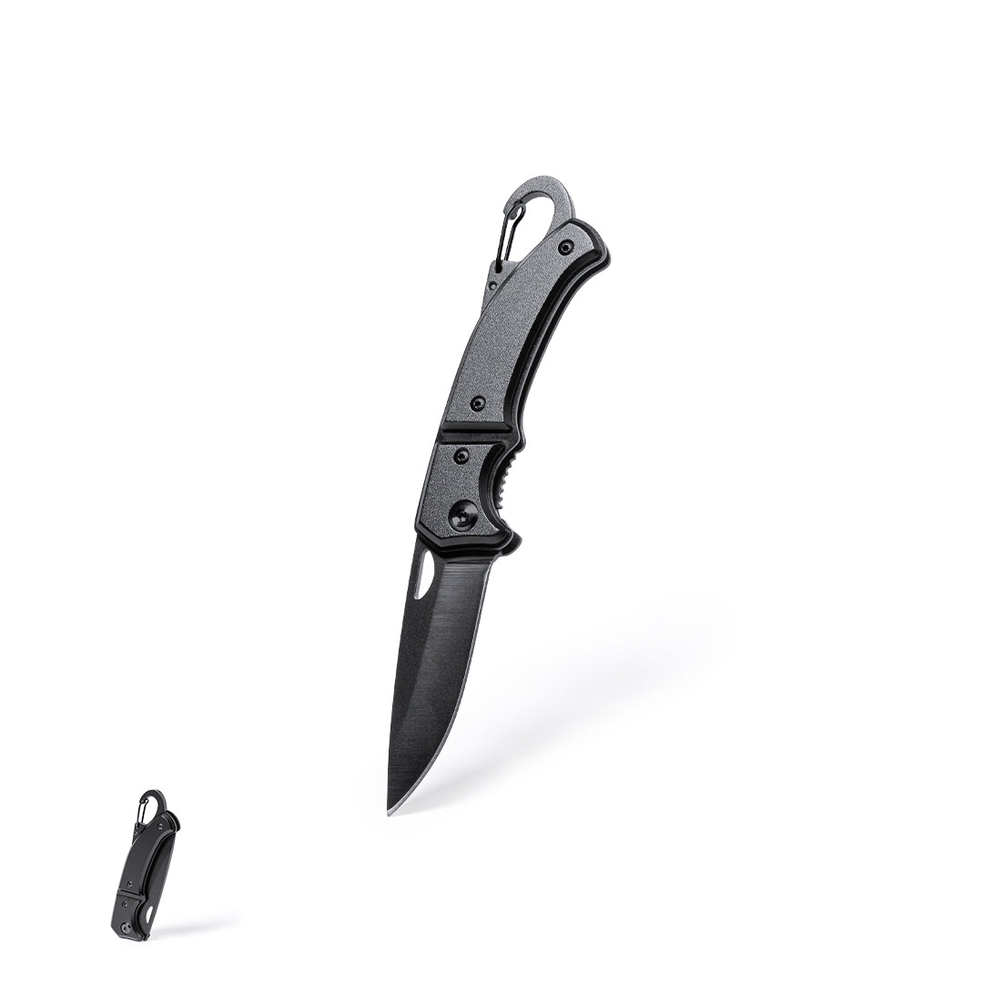 Knife with blade in stainless steel with black finish, and matching resistant aluminium handle. With integrated carabiner in handle and safety lock. Die-cut in blade for easy opening and presented in an individual box in black design.